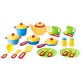 3 years & up. This kitchen set has pots and pans, soup pot, salt and pepper shakers, utensils and a place setting for two. Includes a total of 27 pieces.- 27 pieces